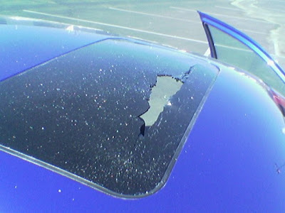A weird metallic object fell from the sky with enough force to go right through the moonroof and even cause a small tear on my seat. Oh. And it happened in the parking lot of Disney Land.